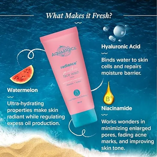 Revitalize your skincare routine with Aqualogica Radiance+ Smoothie Face Wash, now available at Gupta Cosmetics. This 100ml cleanser combines Niacinamide and Watermelon Extract to visibly reduce dark spots and hyperpigmentation while improving skin texture. Suitable for all skin types, including acne-prone and sensitive skin, this gentle yet effective formula from our face wash collection removes impurities without stripping natural moisture.