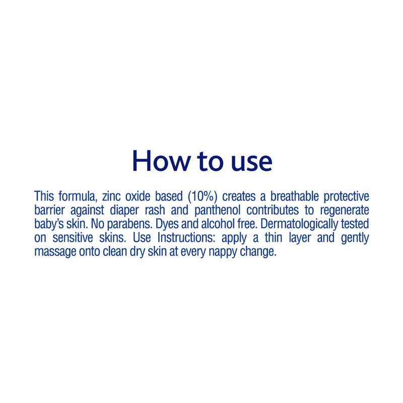 ● Zinc oxide and Panthenol regenerative formula: The formula of Diaper rash cream is made with Zinc oxide (10%), allantoin, and panthenol, also known as pro-vitamin B5, to give complete protection against rashes and repair baby’s delicate skin by creating a breathable barrier.