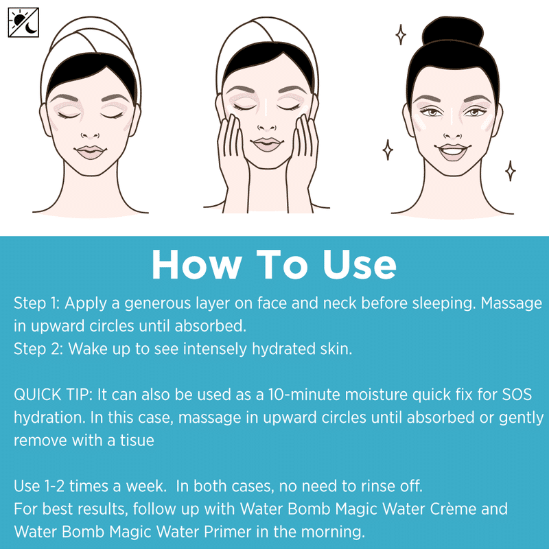 After using moisturiser, apply generously to the face and neck before sleeping. For best results, follow up with Water Bomb Magic Water Creme and Magic Water Primer for continuous hydration.