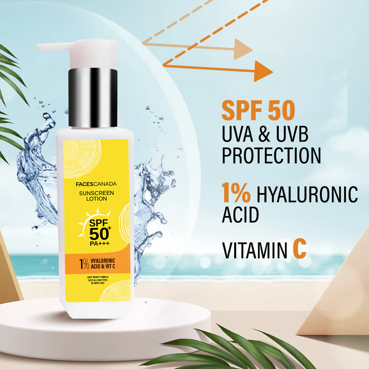 Introducing FACES CANADA Sunscreen Lotion with SPF 50, and PA+++. Say goodbye to heavy, greasy sunscreens! Our lightweight formula is specifically designed for both face and body, ensuring effortless application without leaving any white residue.