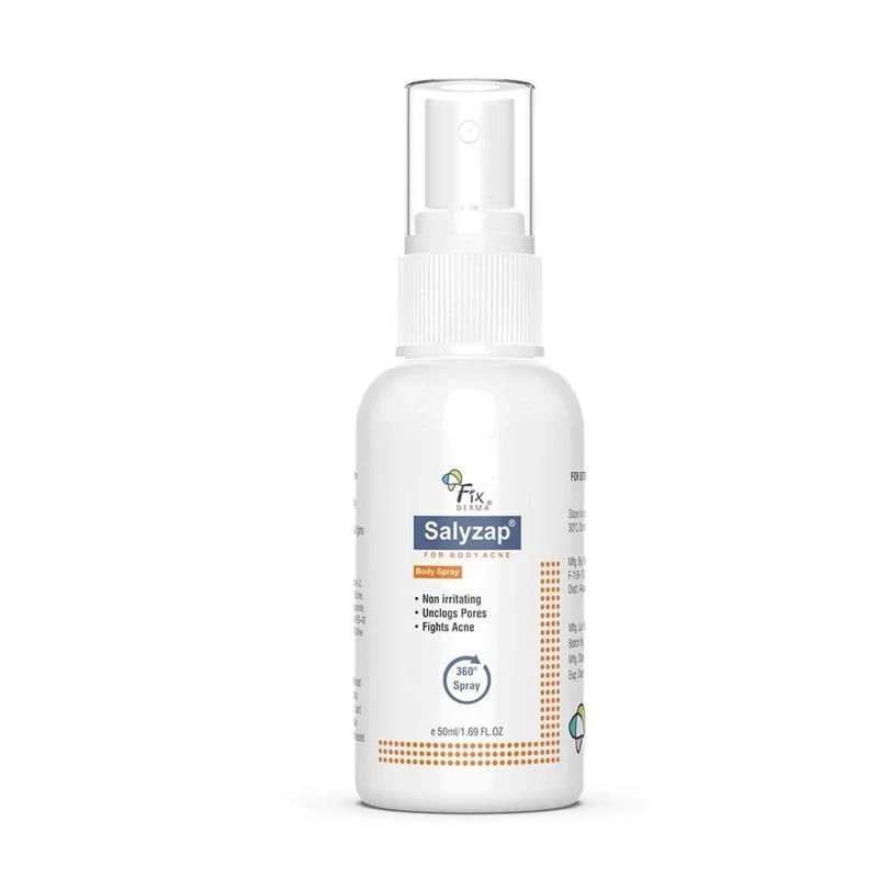 Fixderma Salyzap Body Spray is a mild, non-irritating, yet highly effective body spray. For Acne on back, upper arms, buttocks and other affected body parts. It clears the pores, kills bacteria, calms redness and fights acne form.