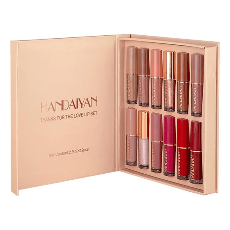 Handaiyan 12 Color Matte Liquid Lipstick Thanks For Love Lip Set – the ultimate collection for flawless, long-lasting color that stays put all day! Elevate your makeup game with this vibrant set of 12 highly pigmented matte shades, designed to suit every mood, occasion, and skin tone.