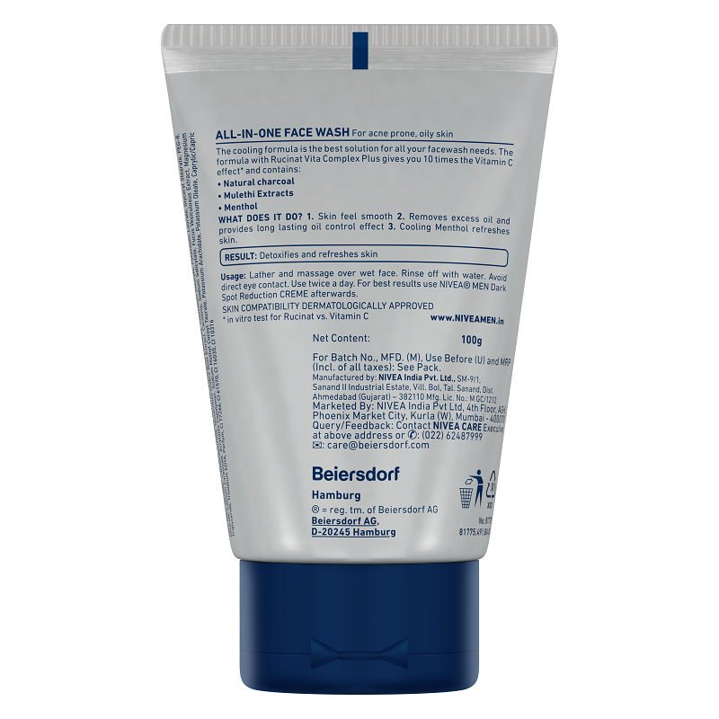 Get rid of oiliness and reduce acne with NIVEA MEN All-in-1 Face Wash. The formula enriched with natural charcoal extracts provides long lasting oil control effect to reduce acne. It deeply cleanses your skin making it smooth and the cooling menthol leaves you feeling refreshed. Ideal for acne prone and oily skin.