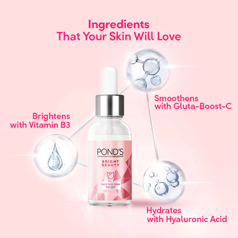 Harness the power of Gluta-Boost-C|| Vitamin B3 and Hyaluronic Acid for a spot-less bright glow. Pond’s Bright Beauty Spot-less Glow Serum gives your skin a bright|| hydrated glow. With regular use|| spots fade away with this serum. It provides a triple glow that helps deliver brighten|| hydrate & smoothen skin. It is non-greasy and absorbs quickly into your skin.