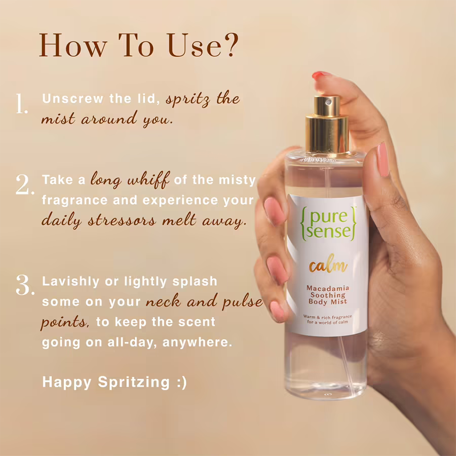 - Add this to your everyday routine and envelope your senses in a warm rich fragrance & enter a world of calm with the fragrance of Macadamia sourced from Australia. An aromatic blend of luxurious oils, this delicate and warm fragrance keeps you feeling fresh & calm throughout the day. That is not all, this luxurious body mist is an instant mood changer and lets you escape to a world of tranquillity This body mist is not tested on animals and is cruelty-free. Its long-lasting fragrance stays throughout the day and makes you feel relaxed and calm. Mesmerize yourself with its fruity scent as often as desired to smell divine and pure.