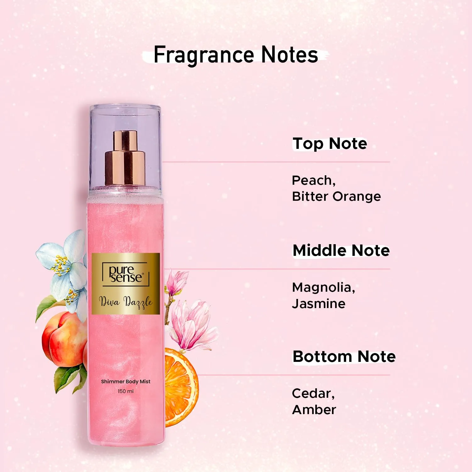 - Embrace your inner goddess and ignite the spark of sensuality with PureSense “Diva Dazzle” Pink Shimmer Body Mist.
