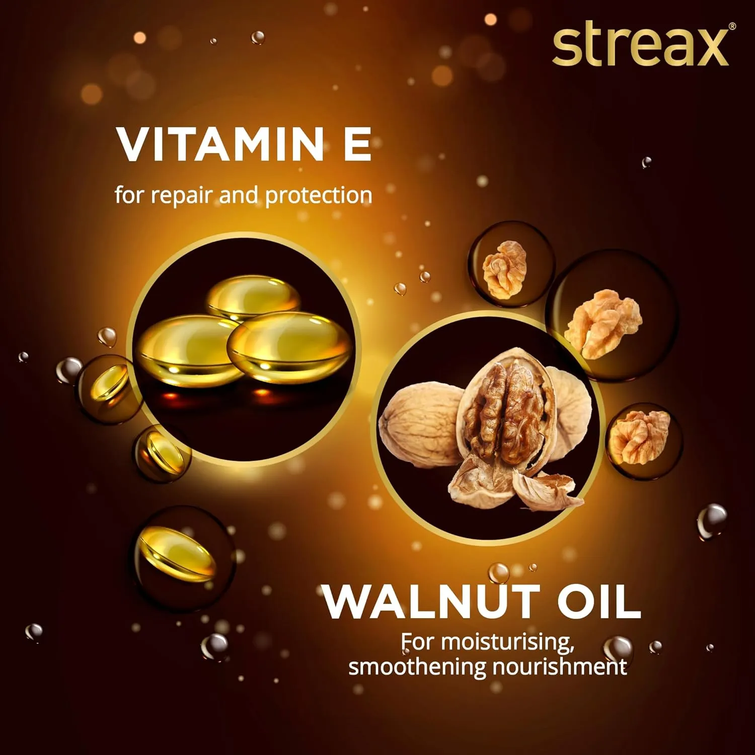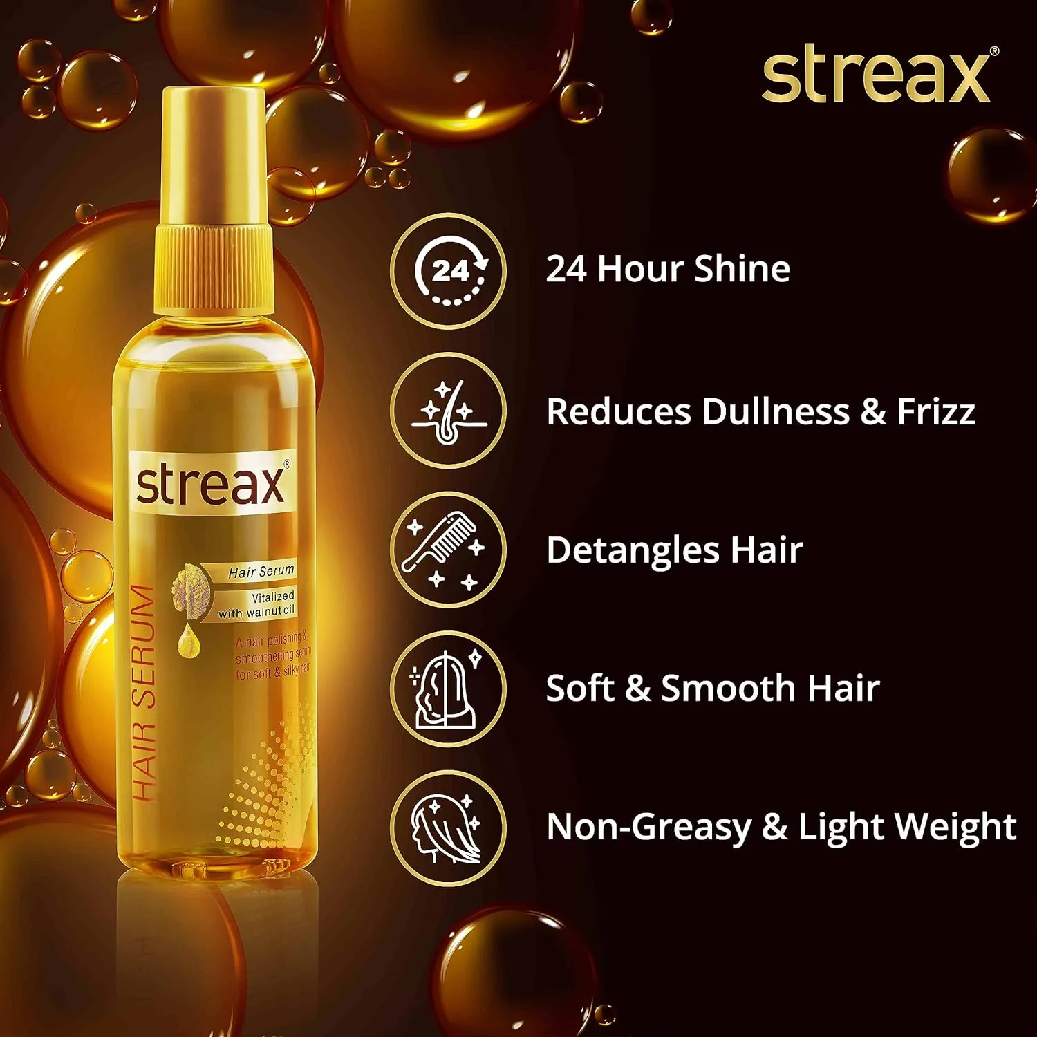 - Elevated with Essential Walnut Oil : Experience the brilliance and nourishment for glossy, shiny locks with every drop of out hair serum. The streax hair serum is enriched with Walnut Oil, an important requisite to achieve healthy, nourished hair. Our expert-curated formula brings you the best of nature and innovation, making for an ideal hair serum for frizzy hair.